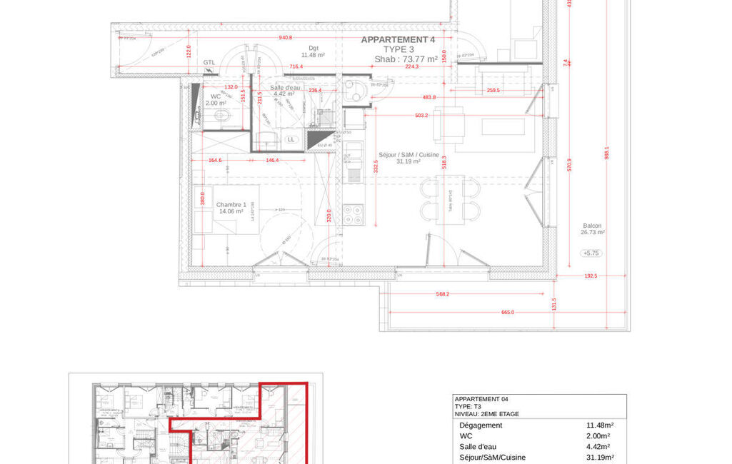 L'appartement se compose d'un pièce de vie, vue mer, ouvert sur une terrasse (26m2) de deux chambres, wc et salle d'eau.